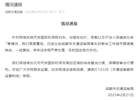 成都市交通运输局2月22日凌晨通报:针对网络反映天府国际机场网约车、出租车加价、拒载以及不法人员喊客拉客等情况,成都市交通运输局高度重视,已成立由成都市交通运输局牵头的联合工作组开展调查核实,一经查实,将依法依规严肃处理,及时回应各方关切。